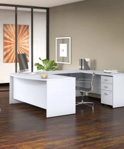 Give your office the workspace you need and the style you deserve with this Bush Business Furniture Studio C U Shaped Desk with Mobile File Cabinet. The extended surface of the 72W x 36D Bow Front Desk offers guests a rounded front to pull up a chair and collaborate, while the expansive U shaped configuration has all the room you could ever want to spread out and multitask. With a thermally fused laminate finish, this office set stands up to years of everyday use. Keep pesky computer cords out of your way with a cable management system for a neat work surface. The 3 Drawer Mobile File Cabinet rolls with you throughout your office or remains in place as needed on any surface. The popular, classic office furniture design receives a contemporary update with trendy White and Storm Gray finish options to fit seamlessly in a private office or as part of a larger environment. This office set comes meets ANSI/BIFMA quality test standards for performance and safety.