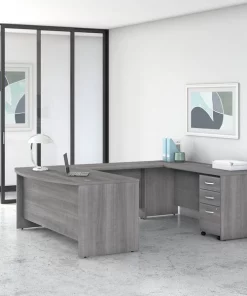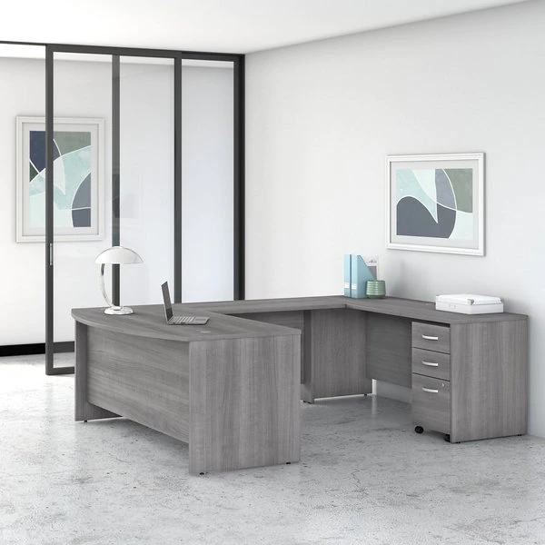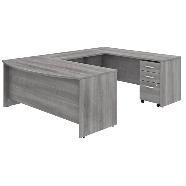 Give your office the workspace you need and the style you deserve with this Bush Business Furniture Studio C U Shaped Desk with Mobile File Cabinet. The extended surface of the 72W x 36D Bow Front Desk offers guests a rounded front to pull up a chair and collaborate, while the expansive U shaped configuration has all the room you could ever want to spread out and multitask. With a thermally fused laminate finish, this office set stands up to years of everyday use. Keep pesky computer cords out of your way with a cable management system for a neat work surface. The 3 Drawer Mobile File Cabinet rolls with you throughout your office or remains in place as needed on any surface. One file drawer accepts legal, letter and A4-size paperwork while two box drawers organize small office supplies. A single lock secures the two bottom drawers to protect sensitive documents and personal items. The popular, classic office furniture design is available in your choice of several contemporary and traditional finishes to fit any work environment. This desk with storage set comes meets ANSI/BIFMA quality test standards for performance and safety.
