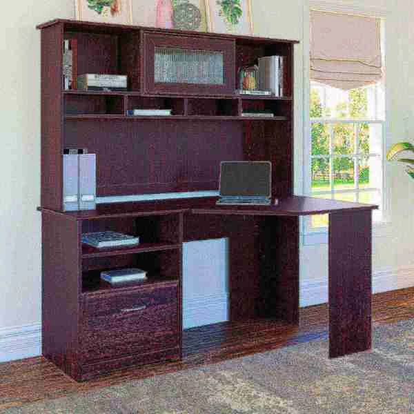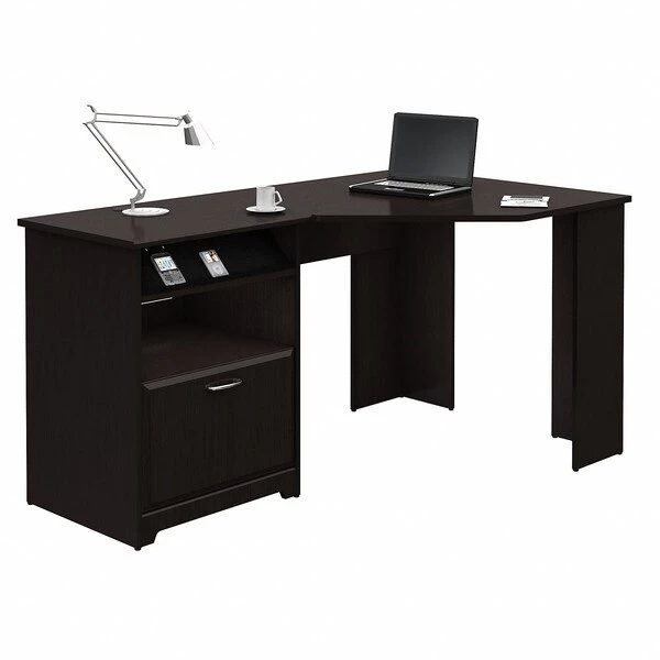 The stylish and functional Bush Furniture Cabot Corner Desk with Hutch offers everything you need for a simple space-saving home office solution. The 60W Corner Desk with Hutch combination is ideal for small spaces, yet provides ample room to work comfortably and stay organized. The Corner Computer Desk's storage can be placed on the right or left side for user preference and comfort. A full-extension file drawer glides on smooth ball bearing slides for an effortless reach to letter and legal size documents, and an open cubby shelf works perfectly for displaying books or office supplies. Cable management grommets on the Desk surface let you easily hide unsightly cords. The Hutch boasts an elegant fluted glass door, two open compartments and four work-in-progress areas to help keep your Desk surface clutter free. Choose from a wide variety of contemporary and traditional finishes with stylish hardware for a simple, elegant and timeless appearance. This home office desk with storage set is tested to meet ANSI/BIFMA quality standards for safety and performance. See the full collection for coordinating items available.