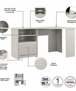 The stylish and functional Bush Furniture Cabot Corner Desk with Hutch offers everything you need for a simple space-saving home office solution. The 60W Corner Desk with Hutch combination is ideal for small spaces, yet provides ample room to work comfortably and stay organized. The Corner Computer Desk's storage can be placed on the right or left side for user preference and comfort. A full-extension file drawer glides on smooth ball bearing slides for an effortless reach to letter and legal size documents, and an open cubby shelf works perfectly for displaying books or office supplies. Cable management grommets on the Desk surface let you easily hide unsightly cords. The Hutch boasts an elegant fluted glass door, two open compartments and four work-in-progress areas to help keep your Desk surface clutter free. Choose from a wide variety of contemporary and traditional finishes with stylish hardware for a simple, elegant and timeless appearance. This home office desk with storage set is tested to meet ANSI/BIFMA quality standards for safety and performance. See the full collection for coordinating items available.