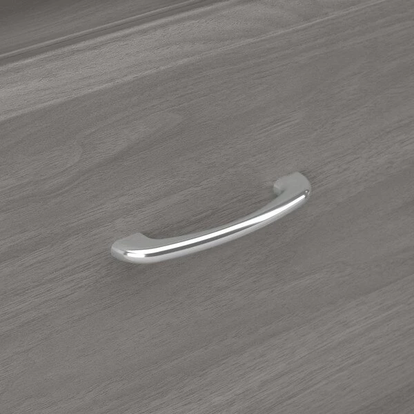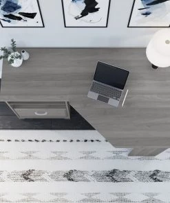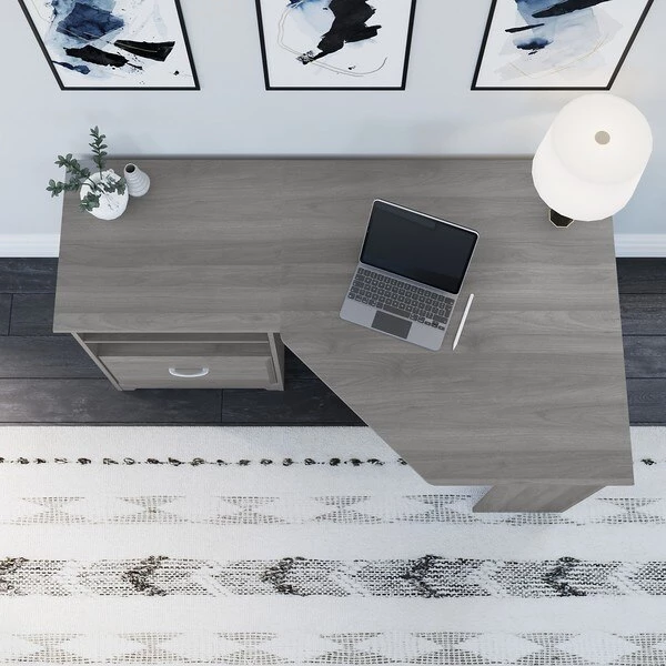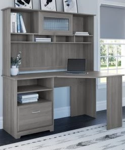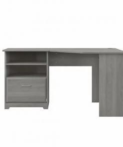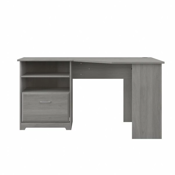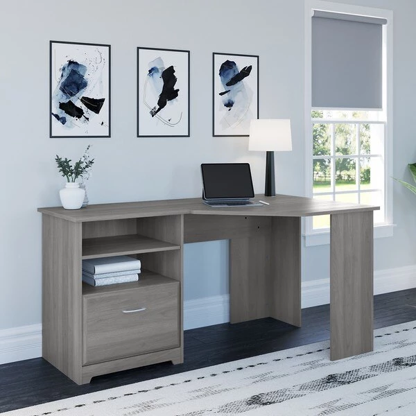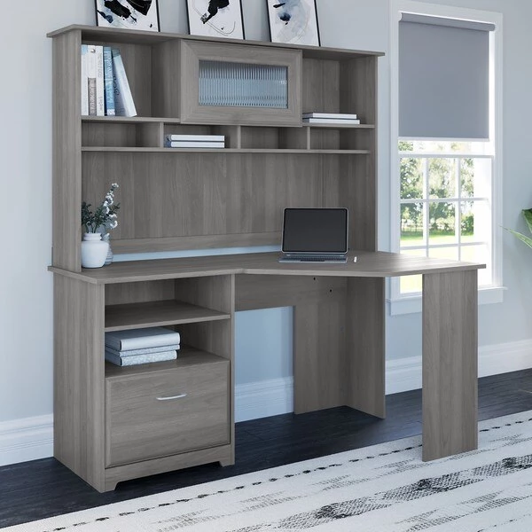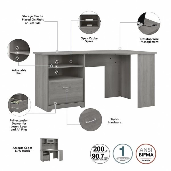 The Bush Furniture Cabot 60W Corner Desk offers ample storage, technology integration and plenty of workspace for a stylish addition to your home office. The corner computer desk's storage drawer and shelf can be placed on whichever side you prefer for a customizable configuration. The unique design saves space in compact areas while still providing a roomy work surface to spread out and be productive. A full-extension file drawer opens on smooth ball bearing slides for an effortless reach to letter, legal and A4 size paperwork while an open cubby shelf works perfectly for storing books and more. Built-in wire management grommets on the desktop let you easily hide unsightly cords and cables. Choose from a wide variety of contemporary and traditional finishes with stylish hardware for a simple, elegant and timeless appearance. This home office desk with storage is tested to meet ANSI/BIFMA quality standards for safety and performance. Add the Cabot Hutch (sold separately) to increase the storage and display capacity of your workspace. See the full collection for coordinating items available.