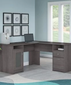 The Bush Furniture Cabot 60W L Shaped Computer Desk offers a spacious and efficient workspace for your home office. Enjoy a beautiful traditional look with smart features for your convenience. The L Shaped Desk design provides a large, durable work surface and just the right amount of storage to keep you feeling neat and organized. Desk storage details include an enclosed cabinet with stylish fluted glass door and a box drawer for supplies. A file drawer opens on smooth full-extension ball bearing slides for an effortless reach to letter, legal or A4 sized paperwork. A built-in 4-port USB hub keeps all of your devices connected while you work. The corner desk design saves space in compact areas, but provides you with 60 inches to spread out in either direction. Choose from a wide variety of contemporary and traditional finishes with stylish hardware for a simple, elegant and timeless appearance. This home office desk with storage is tested to meet ANSI/BIFMA quality standards for safety and performance. Add the Cabot Hutch (sold separately) to either side of the L Shaped Desk to create a complete home office furniture set. See the full collection for coordinating items available.