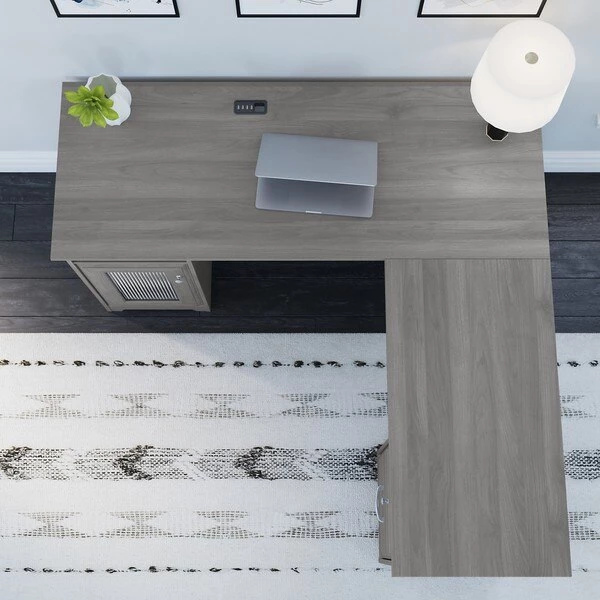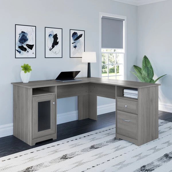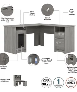 The Bush Furniture Cabot 60W L Shaped Computer Desk offers a spacious and efficient workspace for your home office. Enjoy a beautiful traditional look with smart features for your convenience. The L Shaped Desk design provides a large, durable work surface and just the right amount of storage to keep you feeling neat and organized. Desk storage details include an enclosed cabinet with stylish fluted glass door and a box drawer for supplies. A file drawer opens on smooth full-extension ball bearing slides for an effortless reach to letter, legal or A4 sized paperwork. A built-in 4-port USB hub keeps all of your devices connected while you work. The corner desk design saves space in compact areas, but provides you with 60 inches to spread out in either direction. Choose from a wide variety of contemporary and traditional finishes with stylish hardware for a simple, elegant and timeless appearance. This home office desk with storage is tested to meet ANSI/BIFMA quality standards for safety and performance. Add the Cabot Hutch (sold separately) to either side of the L Shaped Desk to create a complete home office furniture set. See the full collection for coordinating items available.