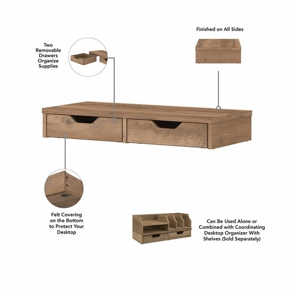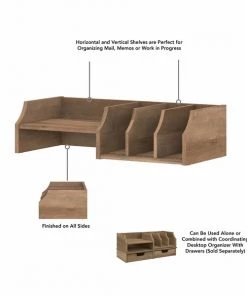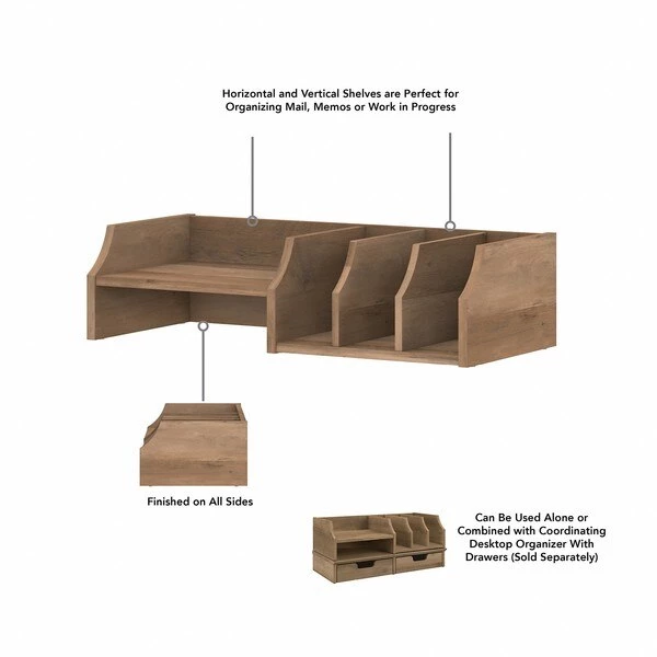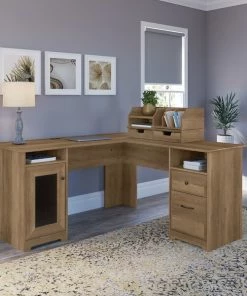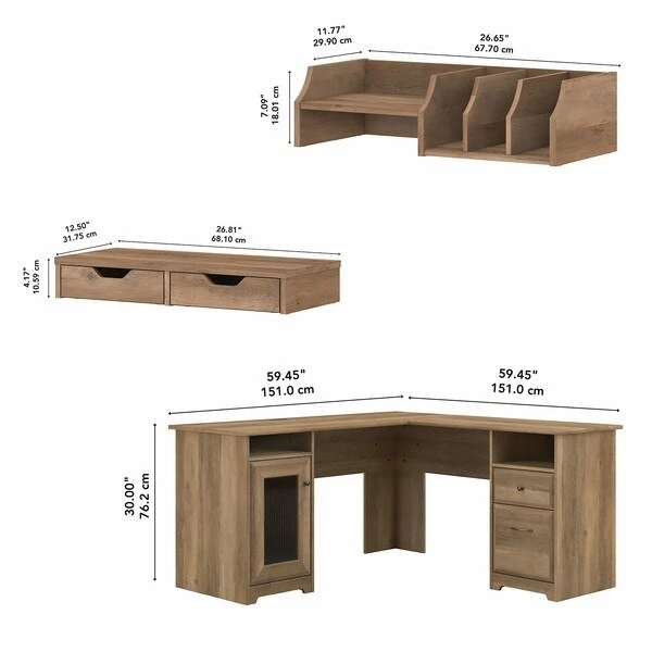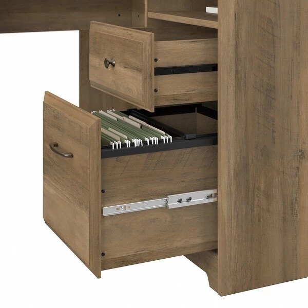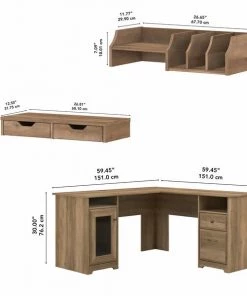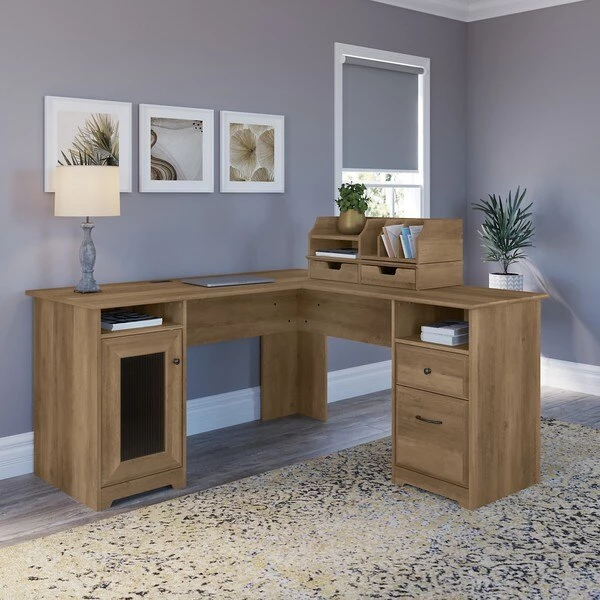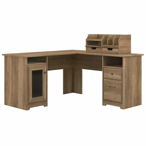 The Bush Furniture Cabot 60W L Shaped Computer Desk with Desktop Organizers offers a spacious and efficient workspace for your home office. Enjoy a beautiful traditional look with smart features for your convenience. The L Shaped Desk design provides a large, durable work surface and just the right amount of storage to keep you feeling neat and organized. Desk storage details include an enclosed cabinet with a stylish fluted glass door and a box drawer for supplies. A file drawer opens on smooth full-extension ball bearing slides for an effortless reach to letter, legal or A4 sized paperwork. A built-in 4-port USB hub keeps all your devices connected while you work. The corner desk design saves space in compact areas but provides a generous 60 inches to spread out in either direction. The included two-piece desk organizer features vertical and horizontal shelving for mail, stationery, work-in-progress and more as well as two drawers for storing small office supplies and writing utensils. Choose between attractive Linen White Oak and Reclaimed Pine finishes with stylish hardware for a simple, elegant and timeless appearance. This home office desk with storage set is tested to meet ANSI/BIFMA quality standards for safety and performance. See the full collection for coordinating items available.