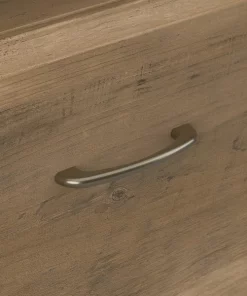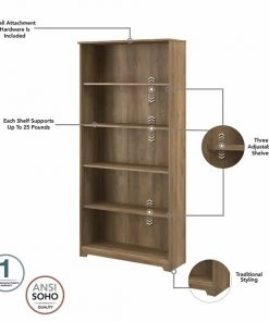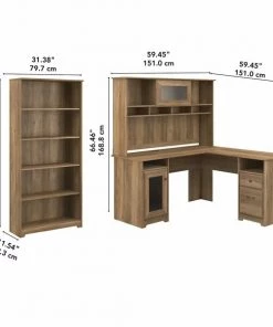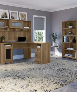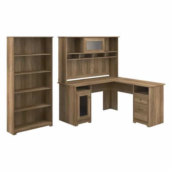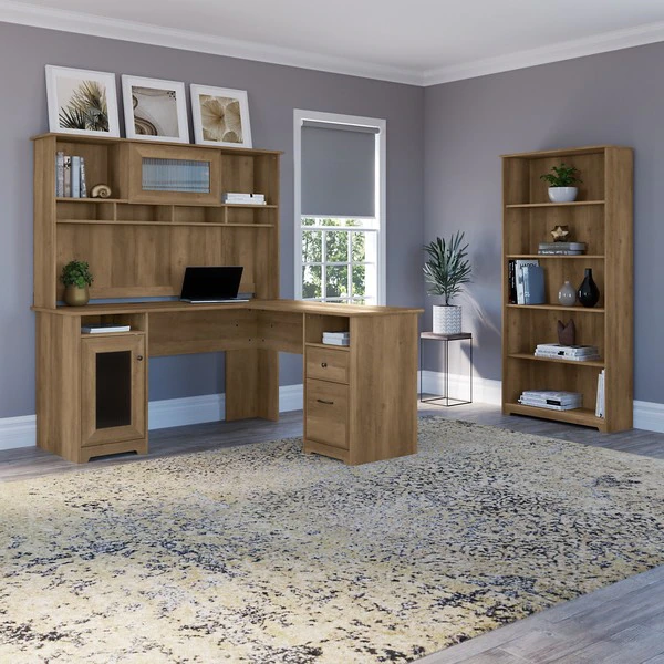 Work in style with the Bush Furniture Cabot L Shaped Computer Desk with Hutch and 5 Shelf Bookcase. Enjoy a beautiful traditional look with smart features included for your convenience. The L Shaped Desk design provides a large durable work surface and just the right amount of storage to keep you feeling neat and organized. Desk storage details include an enclosed cabinet with a stylish fluted glass door and a box drawer for supplies. A file drawer opens on smooth full-extension ball bearing slides and accommodates letter, legal or A4-sized files. Technology features such as a built-in 4-port USB hub keep devices connected. The Hutch boasts a matching fluted glass door, two large open compartments and four work-in-progress areas to help keep your Desk surface clutter free, along with a cable management system to control cords. The 5 Shelf Bookcase creates the perfect spot for books or decorations and is designed with three adjustable shelves for flexible storage and two fixed shelves for structural strength. Choose from a wide variety of contemporary and traditional finishes with stylish hardware for a simple, elegant and timeless appearance. This L Desk with Storage is tested to meet ANSI/SOHO quality standards for safety and performance. See the full collection for coordinating items available.