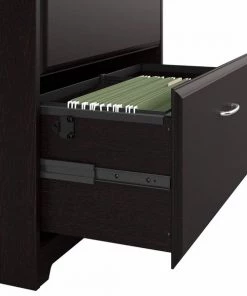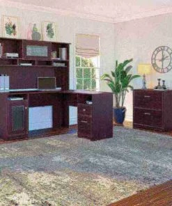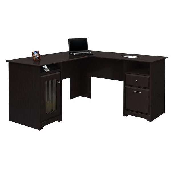 Work in style with the Bush Furniture Cabot L Shaped Computer Desk with Hutch and Lateral File Cabinet. Enjoy a beautiful traditional look with smart features for your convenience. The L Shaped Desk design provides a large durable work surface and just the right amount of storage to keep you feeling neat and organized. Desk storage details include an enclosed cabinet with a stylish fluted glass door, a box drawer for supplies and a full-extension file drawer. Integrated technology features like a built-in 4-port USB hub keep all your devices connected while you work. The Hutch boasts a matching fluted glass door, two large open compartments and four work-in-progress areas to help keep your Desk surface clutter free, along with a cable management system to control your cords. Featuring two spacious drawers, the Lateral File Cabinet is crafted to hold both letter and legal-size files with ease. Each drawer opens on smooth full-extension ball bearing slides for an effortless reach to contents. The filing cabinet matches the Desk's height to extend your work area when placed side by side. Choose from a variety of traditional and contemporary finish options to find the perfect look for your space. This home office desk with storage set meets ANSI/SOHO test standards for safety and performance.