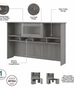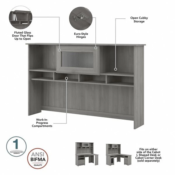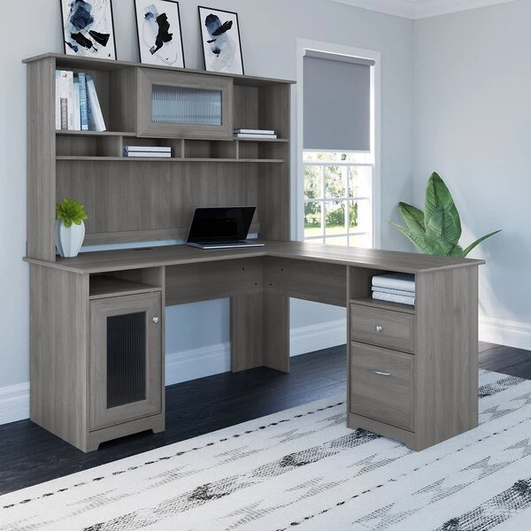 The Bush Furniture Cabot L Shaped Computer Desk with Hutch offers a spacious and efficient workplace for your home office. Enjoy a beautiful traditional look with smart features for your convenience. The L Shaped Desk design provides a large durable work surface and just the right amount of storage to keep you feeling neat and organized. Desk storage details include an enclosed cabinet with a stylish fluted glass door and a box drawer for supplies. A file drawer opens on smooth full-extension ball bearing slides for an easy reach to letter, legal or A4-sized files. A built-in 4-port USB hub adds convenience as you'll keep all of your devices connected. The Hutch boasts a matching fluted glass door, two large open compartments and four work-in-progress areas to help keep your desktop clutter free, along with a cable management system to control your cords. Choose from a wide variety of contemporary and traditional finishes with stylish hardware for a simple, elegant and timeless appearance. This home office desk with storage is tested to meet ANSI/BIFMA quality standards for safety and performance. See the full collection for coordinating items available.