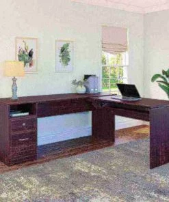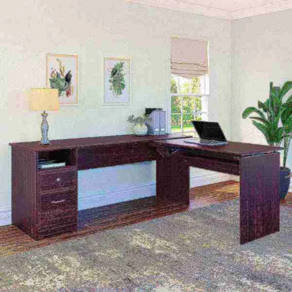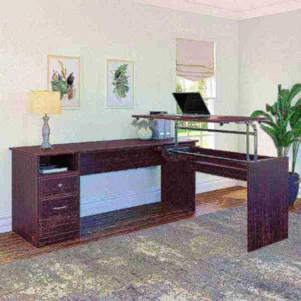 The Cabot L Shaped Sit to Stand Desk turns your home office into an ergonomic workstation designed to help you get organized and be more productive. With a wide work surface you'll enjoy plenty of room for multitasking, and you can save space as the adjustable desk fits perfectly in a corner. Smoothly lift and lock the Return desktop to standing height positions of 36, 39 or 42 inches from the floor and work comfortably, or use the easy adjustability and have a seat when your legs get tired. The Return desktop holds up to 20 pounds when at standing height so you can bring materials with you when you need to stretch your legs. Organize your workspace as this desk with storage includes a box drawer and cubby shelf for supplies, along with a full-extension file drawer. Chrome-finished hardware complements the Espresso Oak or Harvest Cherry finish. Backed by a Bush Furniture . See the full collection of coordinating home furnishings, and design your dream office with the elegant and efficient Cabot Collection.
