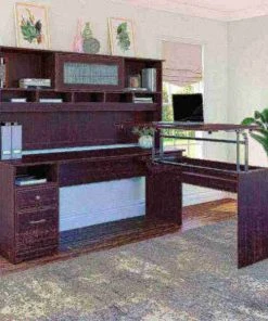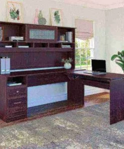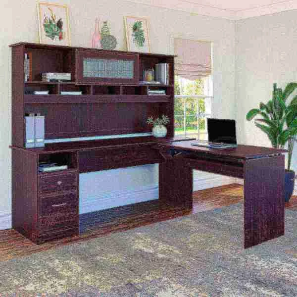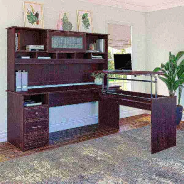The Cabot L Shaped Sit to Stand Desk with Hutch turns your home office into an ergonomic workstation designed to help you get organized and be more productive. With a wide work surface you'll enjoy plenty of room for multitasking, and you can save space as the adjustable desk fits perfectly in a corner. Smoothly lift and lock the Return desktop to standing height positions of 36, 39 or 42 inches from the floor and work comfortably, or use the easy adjustability and have a seat when your legs get tired. The Return desktop holds up to 20 pounds when at standing height so you can bring materials with you when you need to stretch your legs. Organize your workspace as this Desk with Storage includes a box drawer and cubby shelf for supplies, along with a full-extension file drawer. Chrome-finished drawer hardware complements the Espresso Oak or Harvest Cherry finish, while the Hutch offers a beautiful flip-up door and includes open storage space for books or decorations. Backed by a Bush Furniture . See the full collection of coordinating home furnishings, and design your dream office with the elegant and efficient Cabot Collection.