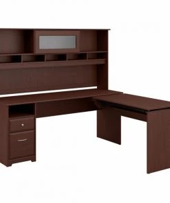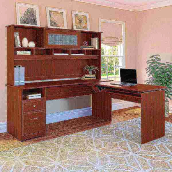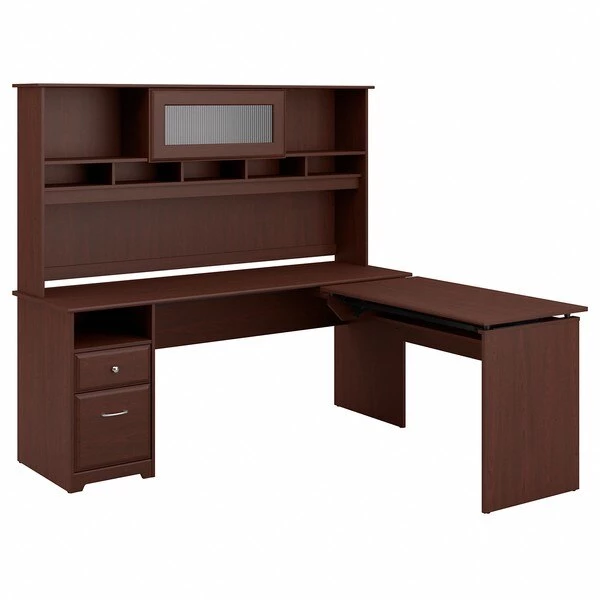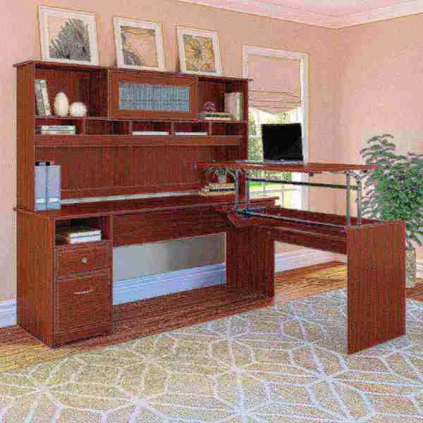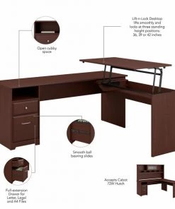 The Cabot L Shaped Sit to Stand Desk with Hutch turns your home office into an ergonomic workstation designed to help you get organized and be more productive. With a wide work surface you'll enjoy plenty of room for multitasking, and you can save space as the adjustable desk fits perfectly in a corner. Smoothly lift and lock the Return desktop to standing height positions of 36, 39 or 42 inches from the floor and work comfortably, or use the easy adjustability and have a seat when your legs get tired. The Return desktop holds up to 20 pounds when at standing height so you can bring materials with you when you need to stretch your legs. Organize your workspace as this Desk with Storage includes a box drawer and cubby shelf for supplies, along with a full-extension file drawer. Chrome-finished drawer hardware complements the Espresso Oak or Harvest Cherry finish, while the Hutch offers a beautiful flip-up door and includes open storage space for books or decorations. Backed by a Bush Furniture . See the full collection of coordinating home furnishings, and design your dream office with the elegant and efficient Cabot Collection.