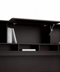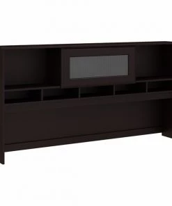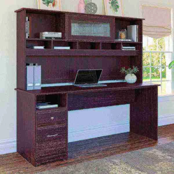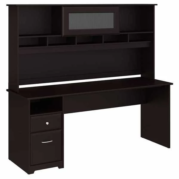 Create a stylish, functional and organized home office with the Bush Furniture Cabot 72W Computer Desk with Hutch and Drawers. The spacious work surface allows you to spread out with your laptop, papers, printer and more with room to spare. Store files and supplies in the included drawers and open cubby shelf, designed for quick and easy access. A smooth full-extension drawer opens effortlessly on reliable ball bearing slides so you'll have no trouble reaching your letter or legal-size files. Beautiful Chrome-finished hardware is the perfect match for the Espresso Oak or Harvest Cherry finish, while the Hutch offers an eye-catching flip-up door and includes open storage space for books or decorations. Backed by a Bush Furniture , the Computer Desk with Hutch and Drawers meets ANSI/SOHO quality test standards for safety and performance. See the full collection of coordinating home furnishings, and design your dream office with the elegant and efficient Cabot Collection.