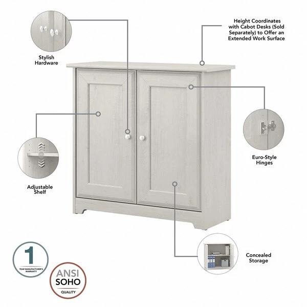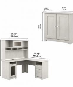 The stylish and functional Bush Furniture Cabot L Shaped Desk with Hutch and Small Storage Cabinet offers a spacious work area for your home or office. Enjoy a beautiful traditional look with smart features. The L Shaped Desk design provides a large durable work surface and storage details including an enclosed cabinet with stylish fluted glass door, a box drawer for supplies and a full-extension file drawer gliding on smooth ball bearing slides for an easy reach to the back. Technology features such as a built-in 4-port USB hub add convenience. The Hutch boasts a matching fluted glass door, large open compartments and four work-in-process areas to help keep your desk surface clutter free, along with a wire management system to control your cables. The Small Storage Cabinet with Doors offers a stylish approach to organizing books, personal items or supplies. Keep everything in order and out of sight with an adjustable shelf to accommodate items of varying sizes. The small cabinet matches desk height to create an extended work surface. Choose from a wide variety of contemporary and traditional finishes with stylish hardware for a simple, elegant and timeless appearance. See the full collection for coordinating items, . This home office set meets ANSI/SOHO standards for safety and performance.