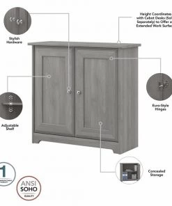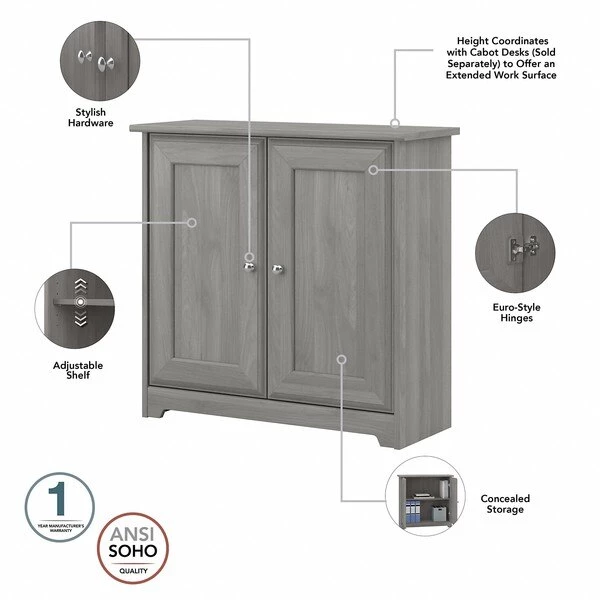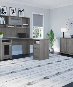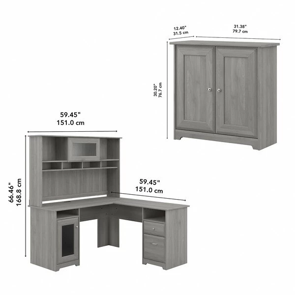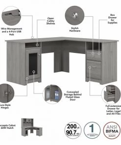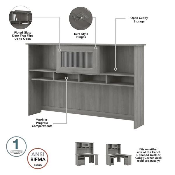 The stylish and functional Bush Furniture Cabot L Shaped Desk with Hutch and Small Storage Cabinet offers a spacious work area for your home or office. Enjoy a beautiful traditional look with smart features. The L Shaped Desk design provides a large durable work surface and storage details including an enclosed cabinet with stylish fluted glass door, a box drawer for supplies and a full-extension file drawer gliding on smooth ball bearing slides for an easy reach to the back. Technology features such as a built-in 4-port USB hub add convenience. The Hutch boasts a matching fluted glass door, large open compartments and four work-in-process areas to help keep your desk surface clutter free, along with a wire management system to control your cables. The Small Storage Cabinet with Doors offers a stylish approach to organizing books, personal items or supplies. Keep everything in order and out of sight with an adjustable shelf to accommodate items of varying sizes. The small cabinet matches desk height to create an extended work surface. Choose from a wide variety of contemporary and traditional finishes with stylish hardware for a simple, elegant and timeless appearance. See the full collection for coordinating items, . This home office set meets ANSI/SOHO standards for safety and performance.