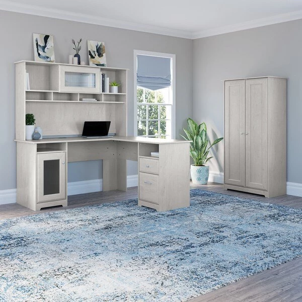 The stylish and functional Bush Furniture Cabot L Shaped Desk with Hutch and Tall Storage Cabinet with Doors offers a spacious workplace for your home office. Enjoy a beautiful traditional look with smart features. The L Shaped Desk design provides a large durable work surface and storage details that include an enclosed cabinet with stylish fluted glass door, a box drawer for supplies and a full-extension file drawer gliding on smooth ball bearing slides for an easy reach to the back. Keep devices connected while you work with a built-in 4-port USB hub. The Hutch boasts a matching fluted glass door, large open compartments and four work-in-process areas to help keep your desk surface clutter free, along with a wire management system to control your cables. The Tall Storage Cabinet with Doors offers a stylish approach to concealed storage for books, personal items or supplies. Keep everything tidy and out of sight with two adjustable shelves and two fixed shelves that accommodate a variety of storage needs. Choose from a wide variety of contemporary and traditional finishes with stylish hardware for a simple, elegant and timeless appearance. See the full collection for coordinating items, . This home office set meets ANSI/SOHO standards for safety and performance.