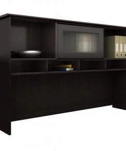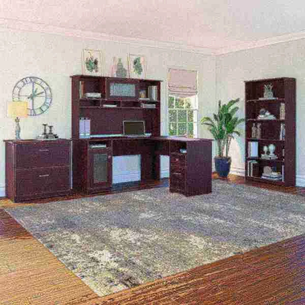 Work in style with the Bush Furniture Cabot L Shaped Desk with Hutch, Lateral File Cabinet and 5 Shelf Bookcase. Enjoy a beautiful traditional look with smart features for your convenience. The L Shaped Desk design provides a large durable work surface and just the right amount of storage to keep you feeling neat and organized. Desk storage details include an enclosed cabinet with a stylish fluted glass door, a box drawer for supplies and a full-extension file drawer. Keep devices connected while you work with a built-in 4-port USB hub. The Hutch boasts a matching fluted glass door, two large open compartments and four work-in-process areas to help keep your Desk surface clutter free, along with a cable management system to control your cords. 5 Shelf Bookcase creates the perfect spot for books or display items and is designed with three adjustable shelves for customization and two fixed shelves for structural strength. Featuring two spacious drawers, the Lateral File Cabinet holds letter and legal-size files with ease. Each drawer opens on smooth full-extension ball bearing slides for an effortless reach to contents. Choose from a wide variety of contemporary and traditional finishes with stylish hardware for a simple, elegant and timeless appearance. This L Desk with Storage set is tested to meet ANSI/SOHO quality standards for safety and performance. See the full collection for coordinating items available.
