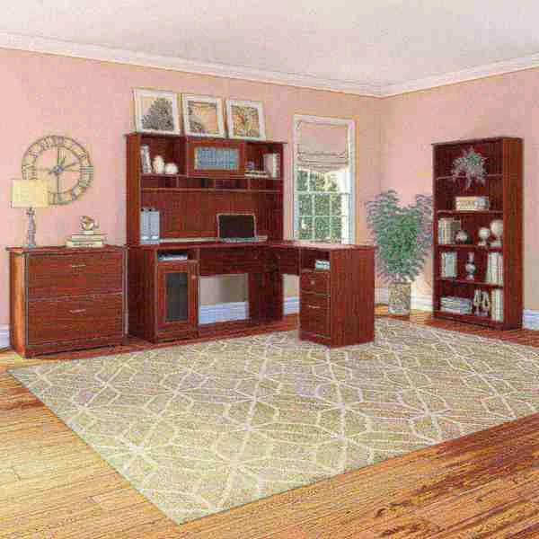 Work in style with the Bush Furniture Cabot L Shaped Desk with Hutch, Lateral File Cabinet and 5 Shelf Bookcase. Enjoy a beautiful traditional look with smart features for your convenience. The L Shaped Desk design provides a large durable work surface and just the right amount of storage to keep you feeling neat and organized. Desk storage details include an enclosed cabinet with a stylish fluted glass door, a box drawer for supplies and a full-extension file drawer. Keep devices connected while you work with a built-in 4-port USB hub. The Hutch boasts a matching fluted glass door, two large open compartments and four work-in-process areas to help keep your Desk surface clutter free, along with a cable management system to control your cords. 5 Shelf Bookcase creates the perfect spot for books or display items and is designed with three adjustable shelves for customization and two fixed shelves for structural strength. Featuring two spacious drawers, the Lateral File Cabinet holds letter and legal-size files with ease. Each drawer opens on smooth full-extension ball bearing slides for an effortless reach to contents. Choose from a wide variety of contemporary and traditional finishes with stylish hardware for a simple, elegant and timeless appearance. This L Desk with Storage set is tested to meet ANSI/SOHO quality standards for safety and performance. See the full collection for coordinating items available.