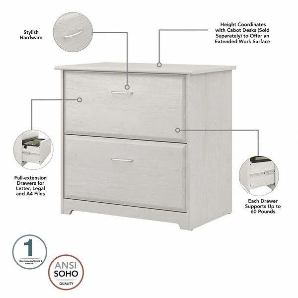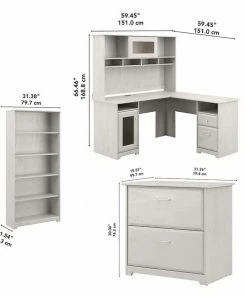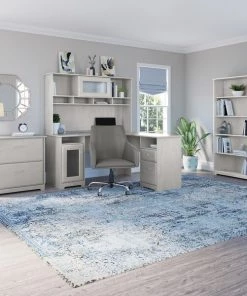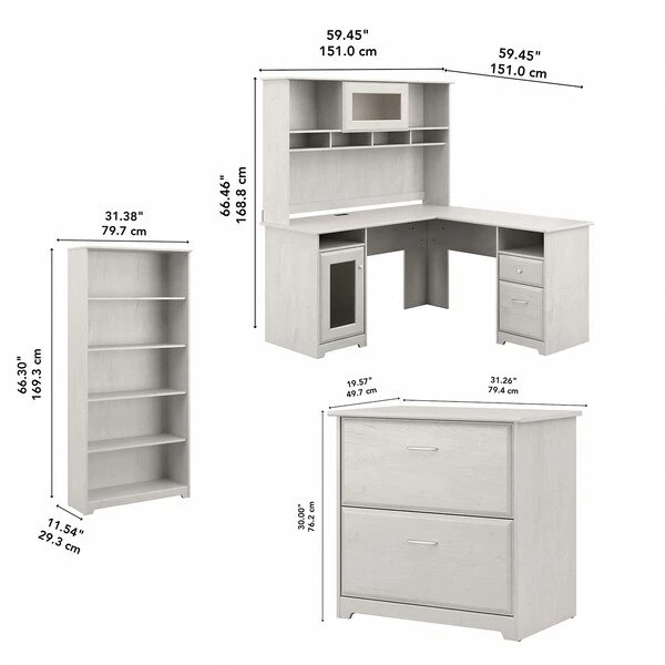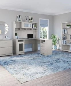 Work in style with the Bush Furniture Cabot L Shaped Desk with Hutch, Lateral File Cabinet and 5 Shelf Bookcase. Enjoy a beautiful traditional look with smart features for your convenience. The L Shaped Desk design provides a large durable work surface and just the right amount of storage to keep you feeling neat and organized. Desk storage details include an enclosed cabinet with a stylish fluted glass door, a box drawer for supplies and a full-extension file drawer. Keep devices connected while you work with a built-in 4-port USB hub. The Hutch boasts a matching fluted glass door, two large open compartments and four work-in-process areas to help keep your Desk surface clutter free, along with a cable management system to control your cords. 5 Shelf Bookcase creates the perfect spot for books or display items and is designed with three adjustable shelves for customization and two fixed shelves for structural strength. Featuring two spacious drawers, the Lateral File Cabinet holds letter and legal-size files with ease. Each drawer opens on smooth full-extension ball bearing slides for an effortless reach to contents. Choose from a wide variety of contemporary and traditional finishes with stylish hardware for a simple, elegant and timeless appearance. This L Desk with Storage set is tested to meet ANSI/SOHO quality standards for safety and performance. See the full collection for coordinating items available.