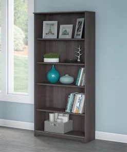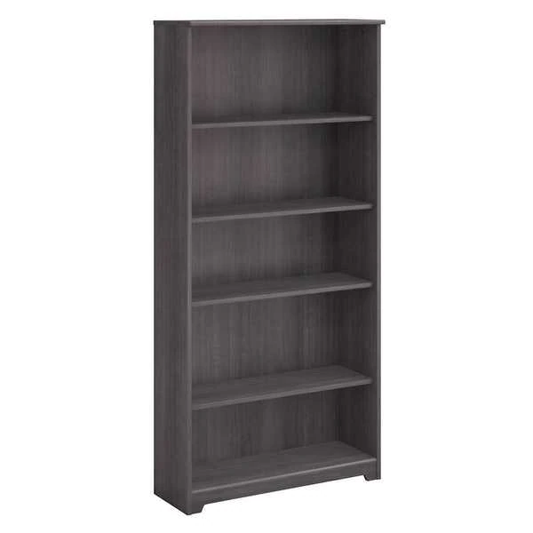 This attractive Bush Furniture Cabot 5 Shelf Bookcase is perfect for the home office, living room or anywhere practical storage is needed. Its sleek profile and tall bookcase design mix style with function at a great value. Use one bookshelf on its own or group a few together to create a complete storage wall. The sophisticated, stable design has two fixed shelves for structural strength and three adjustable shelves that move up or down to accommodate items of various sizes. Each shelf supports up to 25 pounds, so you can confidently store a collection of paperback and hardcover books or brighten up the room with your favorite decorations. Wall attachment hardware is included for family-friendly safety and security. The stylish and timeless design comes in your choice of several traditional or contemporary finish options to complement any environment, and the Bookcase's height matches that of a Cabot Desk with Hutch (sold separately) for a coordinated appearance. This tall bookshelf is tested to meet ANSI/SOHO quality standards for safety and performance. See the full collection for coordinating items available.