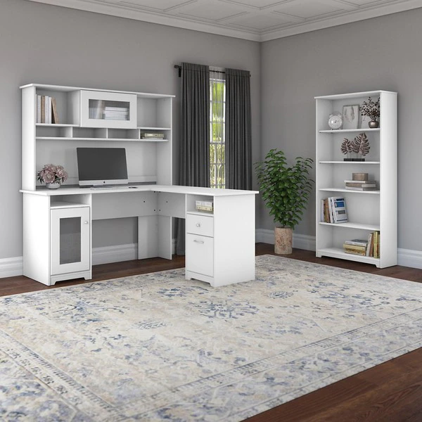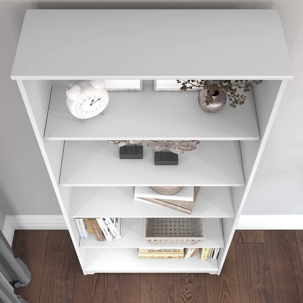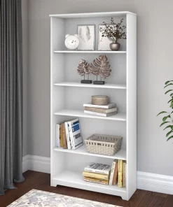 This attractive Bush Furniture Cabot 5 Shelf Bookcase is perfect for the home office, living room or anywhere practical storage is needed. Its sleek profile and tall bookcase design mix style with function at a great value. Use one bookshelf on its own or group a few together to create a complete storage wall. The sophisticated, stable design has two fixed shelves for structural strength and three adjustable shelves that move up or down to accommodate items of various sizes. Each shelf supports up to 25 pounds, so you can confidently store a collection of paperback and hardcover books or brighten up the room with your favorite decorations. Wall attachment hardware is included for family-friendly safety and security. The stylish and timeless design comes in your choice of several traditional or contemporary finish options to complement any environment, and the Bookcase's height matches that of a Cabot Desk with Hutch (sold separately) for a coordinated appearance. This tall bookshelf is tested to meet ANSI/SOHO quality standards for safety and performance. See the full collection for coordinating items available.