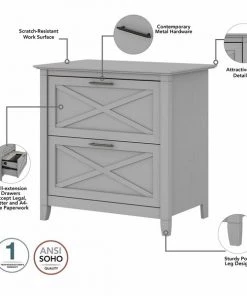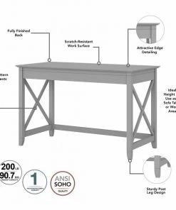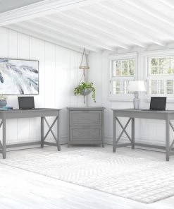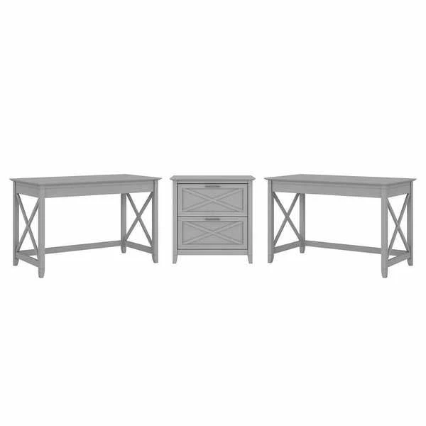 The Bush Furniture Key West 2 Person Desk Set with Lateral File Cabinet offers a flexible home office solution with easy going style. Matching 48W x 24D Writing Desk surfaces provide plenty of room to spread out with a computer and paperwork as you check the mail, pay bills or surf the web. A sturdy and attractive post leg design supports each desktop for a weight capacity of 200 pounds so you can tackle your next project or assignment with all your materials within arm's reach. Position the small desks side by side or front to front for a combined workspace that allows users to share resources, or use one in your home office and the other as a sofa table or console table. The lateral filing cabinet features two drawers that open on smooth full-extension ball bearing slides for an effortless reach to letter, legal and A4-size documents. The 2 Drawer File Cabinet also matches the Desk's height to provide even more configuration options. The home office furniture set's unique X pattern accents and your choice of several casual finishes make it a great fit for homes that embrace cottage, coastal and farmhouse decor. This Desk with File Cabinet Set is tested to meet ANSI/SOHO quality standards for safety and performance. See the full collection for coordinating items to expand your living space with Key West's relaxed style.
