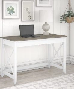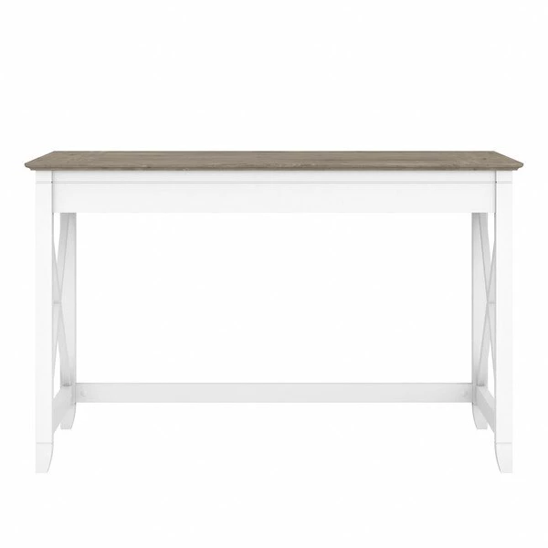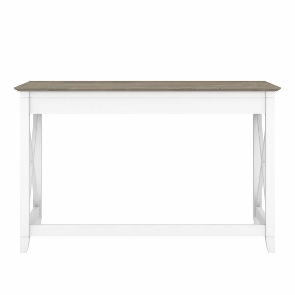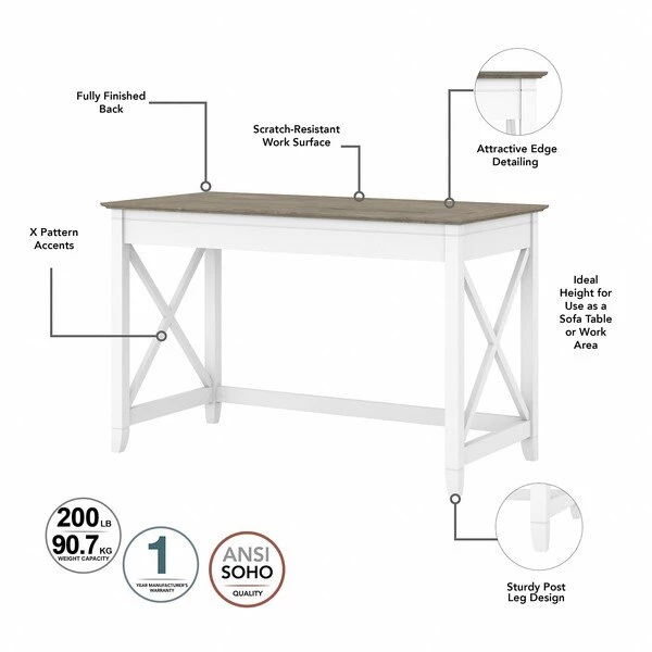 Take on your daily tasks from the comfort of a spacious personal work area, even in small office environments. The Bush Furniture Key West 48W Writing Desk offers more than enough room to spread out with a laptop and paperwork as you surf the web, pay bills or check the mail. Featuring side panels with unique X pattern accents, this office desk creates a relaxed and airy style supported by a sturdy and attractive post leg design. The durable work surface has a weight capacity of 200 pounds so you can confidently keep books and other work materials close by. Measuring 48W x 24D x 30H, this Writing Desk is perfect for use as a sofa table, console table or personal work area and is finished on all sides to look great facing any direction. Expand your workspace with a variety of coordinating items including Desktop Organizers (sold separately) and let the Key West Collection turn your home office or living room into an island escape. Your choice of casual finishes blends seamlessly with homes that embrace coastal and farmhouse decor. This small computer desk is tested to meet ANSI/SOHO quality standards for safety and performance. See the full collection for coordinating items available.