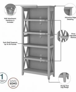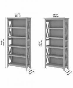 The Bush Furniture Key West Tall 5 Shelf Bookcase Set is a perfect way to show off your favorite artwork, photos, plants and more. These matching Bookcases each include three adjustable shelves to accommodate items of various sizes and two fixed shelves for stability. Each shelf supports up to 50 pounds so you can store your collection of paperback and hardcover books or display decorations with confidence. Place the tall bookshelf set side by side to create a storage wall or position them separately based on the needs of your space. Stylish touches include unique X pattern accents on the side panels as well as a sturdy and attractive post leg design. The 32W x 13D x 66H 5 tier bookshelves include wall attachment hardware for family-friendly safety and security in any home office or living room. A perfect choice for homes that embrace cottage, coastal and farmhouse decor, the Key West Collection includes a wide variety of coordinating items to expand your space as needed. Choose from several casual finishes to complement any room. These 5 Shelf Bookcases are tested to meet ANSI/SOHO quality standards for safety and performance.