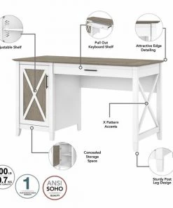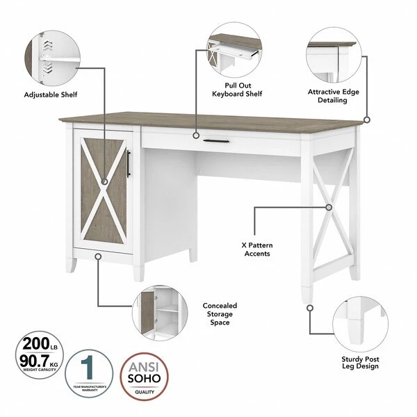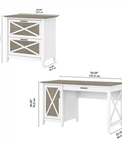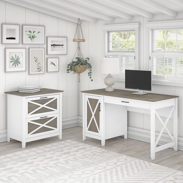 The Bush Furniture Key West 54W Computer Desk with 2 Drawer Lateral File Cabinet offers a refreshing approach to working in your home. Spread out with a computer, books and paperwork as you take on your next project or assignment on a durable 54W x 24D desktop that boasts a weight capacity of 200 pounds. The convenient top drawer is an ideal place to store your keyboard, laptop or tablet and has a flip down front that folds up neatly when not in use. The Desk also includes a built-in storage cabinet with one adjustable shelf to accommodate materials of various sizes. Matching 30H height dimensions allow you to create an extended work surface by placing the office desk and lateral filing cabinet side by side. Two large file drawers open on smooth full-extension ball bearing slides for an easy reach to legal and letter size documents. Unique X pattern accents give this home office furniture set a relaxed feel with a sturdy and attractive post leg design. Find the perfect look for your space with a variety of casual finish options. This desk with drawers set is tested to meet ANSI/SOHO quality standards for safety and performance. See the full collection for coordinating items available and let Key West turn your work or living space into an island escape.
