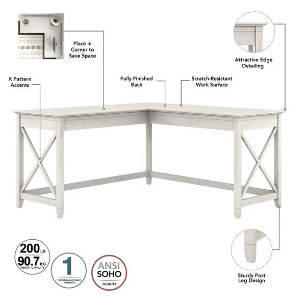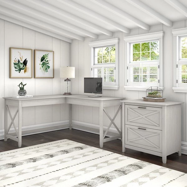 The Bush Furniture Key West 60W L Shaped Desk with Lateral File Cabinet turns any room into a practical home office with easy going style. At 60W x 60D, the durable work surface is spacious enough to spread out with a computer, paperwork and more when taking on your task of the day or just browsing the web. A sturdy post leg design and thoughtful construction with quality materials give the L shaped computer desk a weight capacity of 200 pounds. The 2 drawer filing cabinet opens on smooth full-extension ball bearing slides for an easy reach to legal and letter size documents, and it matches the height of the 30H corner desk to offer an extended work surface when placed side-by-side. Unique X pattern accents on side panels of the L Desk and the Cabinet's file drawers create a relaxed appearance that blends seamlessly with coastal and farmhouse decor. Choose from several casual finishes to find the perfect look for your home office or living room. Complete your personal workspace with coordinating products including a Mobile File Cabinet, 5 Shelf Bookcase and Desktop Organizers (all sold separately). This desk with drawers set is tested to meet ANSI/SOHO quality standards for safety and performance. See the full collection for coordinating items available and let Key West turn your work or living space into an island escape.