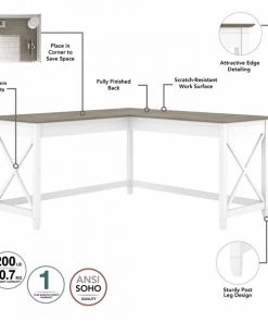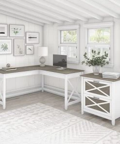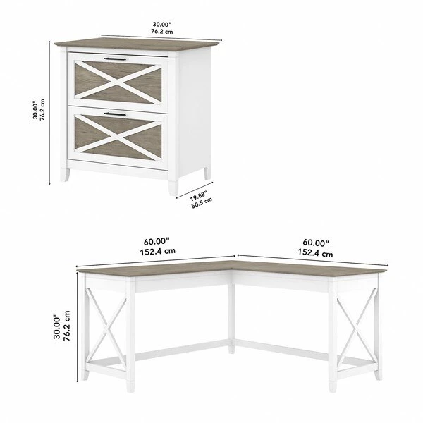 The Bush Furniture Key West 60W L Shaped Desk with Lateral File Cabinet turns any room into a practical home office with easy going style. At 60W x 60D, the durable work surface is spacious enough to spread out with a computer, paperwork and more when taking on your task of the day or just browsing the web. A sturdy post leg design and thoughtful construction with quality materials give the L shaped computer desk a weight capacity of 200 pounds. The 2 drawer filing cabinet opens on smooth full-extension ball bearing slides for an easy reach to legal and letter size documents, and it matches the height of the 30H corner desk to offer an extended work surface when placed side-by-side. Unique X pattern accents on side panels of the L Desk and the Cabinet's file drawers create a relaxed appearance that blends seamlessly with coastal and farmhouse decor. Choose from several casual finishes to find the perfect look for your home office or living room. Complete your personal workspace with coordinating products including a Mobile File Cabinet, 5 Shelf Bookcase and Desktop Organizers (all sold separately). This desk with drawers set is tested to meet ANSI/SOHO quality standards for safety and performance. See the full collection for coordinating items available and let Key West turn your work or living space into an island escape.