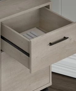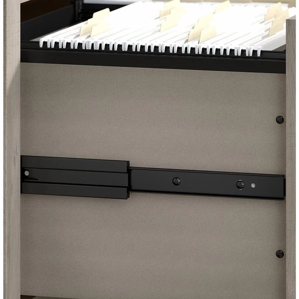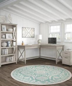 Create a personal workspace with easy going style and plenty of storage for all the materials you need to stay productive. The Bush Furniture Key West 60W L Shaped Desk with Mobile File Cabinet and Tall 5 Shelf Bookcase offers an ideal set up for home and small offices. Save space in compact areas by placing the Desk in a corner or make use of the fully finished back to take a prominent position in the middle of the room. At 60W x 60D and capable of supporting up to 200 pounds, the work surface is spacious and durable enough to spread out with a computer, books, paperwork and more when taking on your task of the day. The 2 drawer filing cabinet fits under the L Desk and has front locking casters for secure placement. The file drawer opens on full-extension ball bearing slides for an easy reach to letter size documents while a box drawer keeps office supplies and utensils close by. The Bookcase features three adjustable shelves for flexible storage and two fixed shelves for stability. Wall attachment hardware is included to fix the bookshelf in place for family-friendly safety. Sturdy post leg designs with unique X pattern accents create a relaxed appearance while your choice of several casual finishes blend seamlessly with coastal and farmhouse decor. This L shaped computer desk with storage set is tested to meet ANSI/SOHO quality standards for safety and performance.