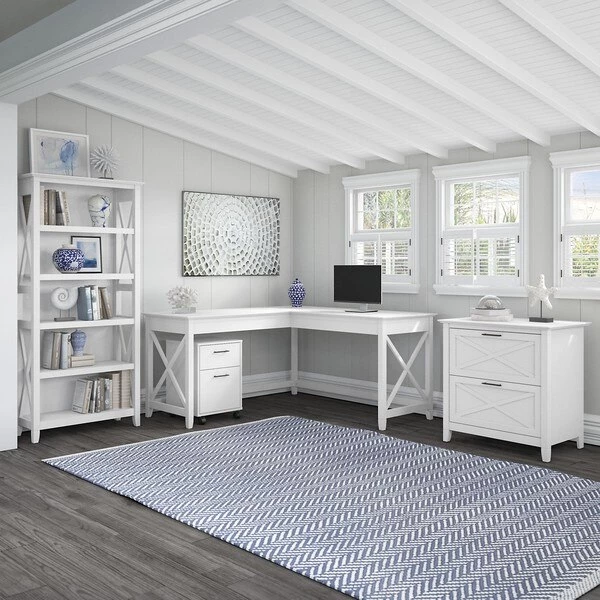 A comprehensive personal workspace with easy going style, the Bush Furniture Key West 60W L Shaped Desk with File Cabinets and Tall 5 Shelf Bookcase offers an ideal set up for home and small offices. At 60W x 60D, the durable work surface is spacious enough to spread out with a computer, paperwork and more when taking on your task of the day or just browsing the web. Keep important materials close by with a Mobile File Cabinet that rolls on dual-wheeled casters and fits conveniently under the Desk. The file drawer opens on smooth ball bearing slides for an easy reach to letter size documents while a box drawer holds smaller office supplies and writing utensils. Store legal and letter size files in the 2 Drawer Lateral File Cabinet, which also has full-extension ball bearing slides and matches the height of the 30H corner desk to offer an extended work surface when placed side-by-side. The Bookcase features three adjustable shelves for flexible storage and display along with two fixed shelves for stability. Wall attachment hardware is included to fix the bookshelf in place for family-friendly safety. Sturdy post leg designs and unique X pattern accents create a relaxed, open appearance while your choice of several casual finishes blend seamlessly with coastal and farmhouse decor. This L shaped computer desk with storage set is tested to meet ANSI/SOHO quality standards for safety and performance.