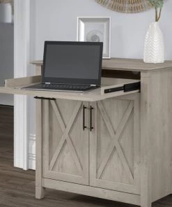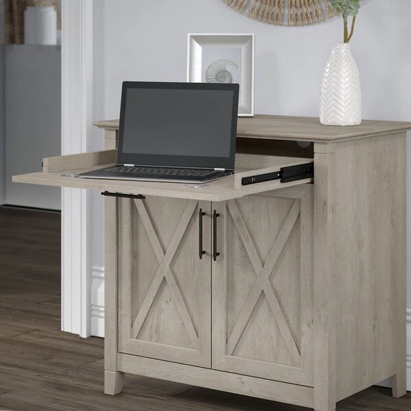 Use the compact Bush Furniture Key West Secretary Desk with Keyboard Tray and Storage Cabinet to create an office as big or small as you want. This small computer desk provides a central location for your laptop and is a casual storage solution that works subtly in any room. The convenient pull out Keyboard Tray with flip down front folds up neatly when not in use and includes wire management. The drawer opens on full-extension ball bearing slides for an easy reach to contents and reliable everyday use. The built-in storage cabinet features one adjustable shelf to help you organize work materials and supplies of various sizes. Unique X pattern accents on the door panels give the armoire desk a relaxed style with a sturdy and attractive post leg design. Choose from several attractive finish options for a look that blends seamlessly with coastal and farmhouse decor. Personalize your Credenza with coordinating Desktop Organizers (sold separately) to keep everything in its place. This small Desk with Storage is tested to meet ANSI/SOHO quality standards for safety and performance. See the full collection for coordinating items available and let Key West turn your home office or living room into an island escape.
