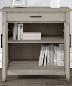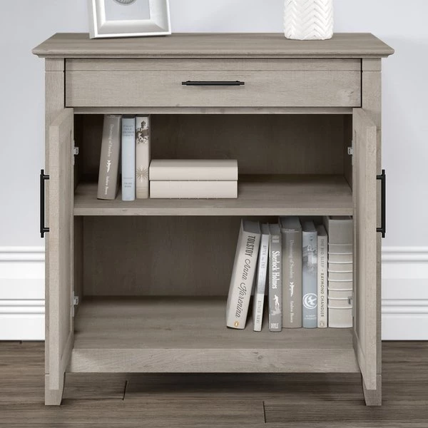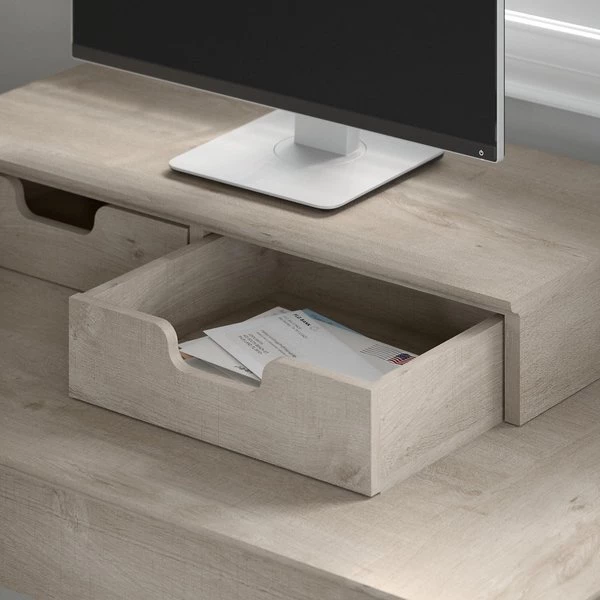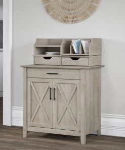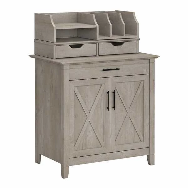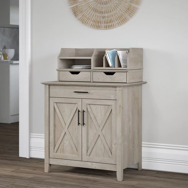Use the compact Bush Furniture Key West Secretary Desk with Storage and Desktop Organizers to create a functional home office in any sized space. This 30W x 20D x 30H small computer desk serves as a central location for your laptop and offers a casual storage solution that works subtly in any room. The convenient top drawer opens on smooth full-extension ball bearing slides and includes a flip down front that folds up neatly when not in use. The built-in storage cabinet features one adjustable shelf to help you organize work materials and supplies of various sizes. Unique X pattern accents on the door panels give the armoire desk a relaxed style with a sturdy and attractive post leg design. The Desk Organizers add two drawers for small office supplies along with horizontal and vertical shelves for sorting mail, memos and work in progress. Choose from several casual finishes for a look that blends seamlessly with coastal and farmhouse decor. This laptop storage credenza with organization is tested to meet ANSI/SOHO quality standards for safety and performance. See the full collection for coordinating items available and let Key West turn your home office or living room into an island escape.