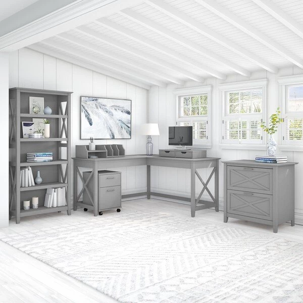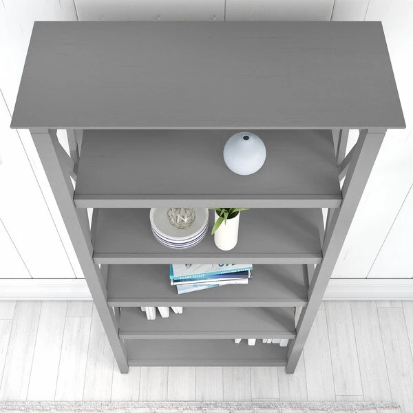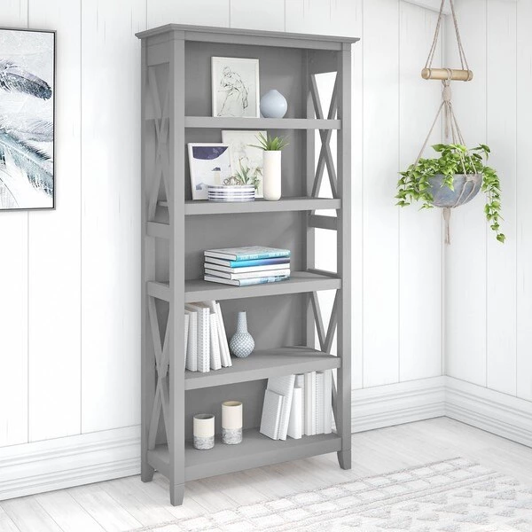 The Bush Furniture Key West Tall 5 Shelf Bookcase is a perfect way to show off your favorite artwork, photos, plants and more. Three adjustable shelves accommodate items of various sizes while two fixed shelves provide stability. Each shelf supports up to 50 pounds so you can store your collection of paperback and hardcover books or display decorations with confidence. Stylish touches include unique X pattern accents on the side panels as well as a sturdy and attractive post leg design. This 32W x 13D x 66H 5 tier bookshelf includes wall attachment hardware for family-friendly safety and security in any home office or living room. A perfect choice for homes that embrace cottage, coastal and farmhouse decor, the Key West Collection includes a wide variety of coordinating items to expand your space as needed. Choose from several casual finishes to complement any room. This tall Bookcase is tested to meet ANSI/SOHO quality standards for safety and performance.