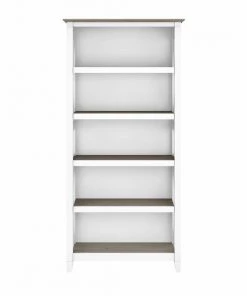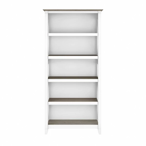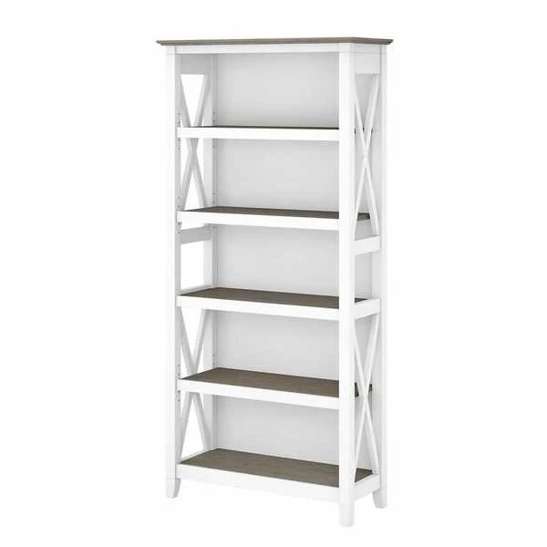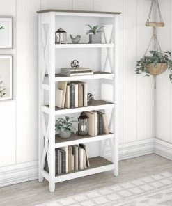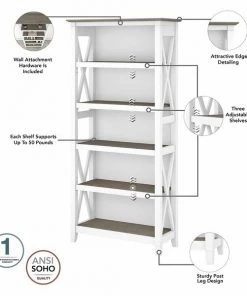 The Bush Furniture Key West Tall 5 Shelf Bookcase is a perfect way to show off your favorite artwork, photos, plants and more. Three adjustable shelves accommodate items of various sizes while two fixed shelves provide stability. Each shelf supports up to 50 pounds so you can store your collection of paperback and hardcover books or display decorations with confidence. Stylish touches include unique X pattern accents on the side panels as well as a sturdy and attractive post leg design. This 32W x 13D x 66H 5 tier bookshelf includes wall attachment hardware for family-friendly safety and security in any home office or living room. A perfect choice for homes that embrace cottage, coastal and farmhouse decor, the Key West Collection includes a wide variety of coordinating items to expand your space as needed. Choose from several casual finishes to complement any room. This tall Bookcase is tested to meet ANSI/SOHO quality standards for safety and performance.