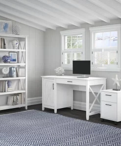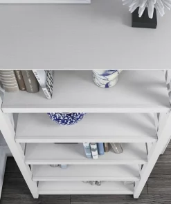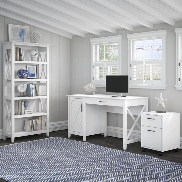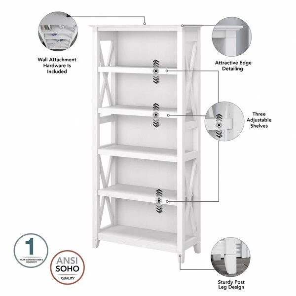 The Bush Furniture Key West Tall 5 Shelf Bookcase is a perfect way to show off your favorite artwork, photos, plants and more. Three adjustable shelves accommodate items of various sizes while two fixed shelves provide stability. Each shelf supports up to 50 pounds so you can store your collection of paperback and hardcover books or display decorations with confidence. Stylish touches include unique X pattern accents on the side panels as well as a sturdy and attractive post leg design. This 32W x 13D x 66H 5 tier bookshelf includes wall attachment hardware for family-friendly safety and security in any home office or living room. A perfect choice for homes that embrace cottage, coastal and farmhouse decor, the Key West Collection includes a wide variety of coordinating items to expand your space as needed. Choose from several casual finishes to complement any room. This tall Bookcase is tested to meet ANSI/SOHO quality standards for safety and performance.