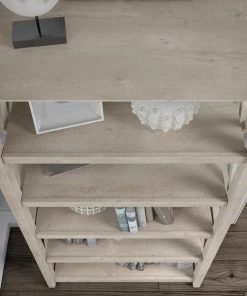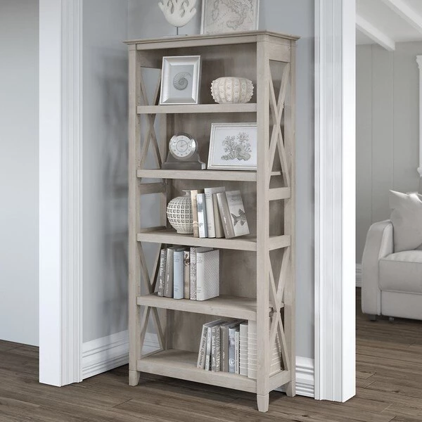 The Bush Furniture Key West Tall 5 Shelf Bookcase is a perfect way to show off your favorite artwork, photos, plants and more. Three adjustable shelves accommodate items of various sizes while two fixed shelves provide stability. Each shelf supports up to 50 pounds so you can store your collection of paperback and hardcover books or display decorations with confidence. Stylish touches include unique X pattern accents on the side panels as well as a sturdy and attractive post leg design. This 32W x 13D x 66H 5 tier bookshelf includes wall attachment hardware for family-friendly safety and security in any home office or living room. A perfect choice for homes that embrace cottage, coastal and farmhouse decor, the Key West Collection includes a wide variety of coordinating items to expand your space as needed. Choose from several casual finishes to complement any room. This tall Bookcase is tested to meet ANSI/SOHO quality standards for safety and performance.