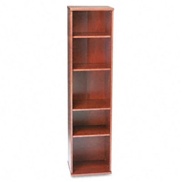 Modern laminate bookcase with Diamond Coat® surface. Five shelves. three adjustable. Open Single Bookcase. Color(s): Medium Cherry; Width: 17 7/8 in; Depth: 15 3/8 in; Height: 72 7/8 in.