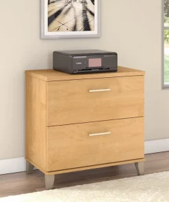 The Bush Furniture Somerset 2 Drawer Lateral File Cabinet provides an appealing home office storage solution. Two large file drawers open on smooth full-extension ball bearing slides for easy access to letter and legal-sized documents, even those all the way at the back. Drawers are designed to open one at a time for maximum stability on any surface, making this filing cabinet a safe and family-friendly addition to your home. The height of the 2 Drawer File Cabinet matches any Somerset Desk (sold separately) to allow for an extended work surface when placed side by side. Transitional styling includes your choice of attractive finishes with tapered leg accents and contemporary metal hardware for an alluring appearance to match your current home office decor. This lateral filing cabinet is tested to meet ANSI/SOHO quality standards for safety and performance. Add the 2 Drawer Lateral File Cabinet to your existing furnishings or expand your home office with a broad range of coordinating desk and storage options from the Somerset Collection.