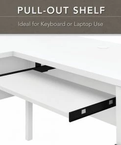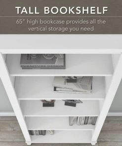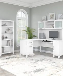 With practical features and a stylish design, the Bush Furniture Somerset 60W L Shaped Desk with Hutch and 5 Shelf Bookcase delivers a personal workspace perfect for the home or small office. The expansive 60W surface with wire management offers ample room to spread out and complete large projects. A convenient pull-out shelf provides a perfect place to keep a keyboard or laptop, while a vertical storage cabinet with an adjustable shelf and a box drawer offer plenty of storage for office supplies and utensils. A file drawer opens on smooth ball bearing slides for an easy reach to letter size documents, even those all the way in the back. The Hutch mounts to either side of the L Shaped Desk and has a large open compartment for books, binders or decorations and two frosted glass doors for concealed storage. The 5 Shelf Bookcase matches the height of the Desk and Hutch set to create a coordinated look in your office. Two of the Bookcase's shelves are fixed for stability and three are adjustable to ensure that items of all sizes have their place. Transitional styling includes your choice of several attractive finishes with tapered leg accents and contemporary metal hardware for an alluring appearance. This home office furniture set is tested to meet ANSI/SOHO quality standards for safety and performance.