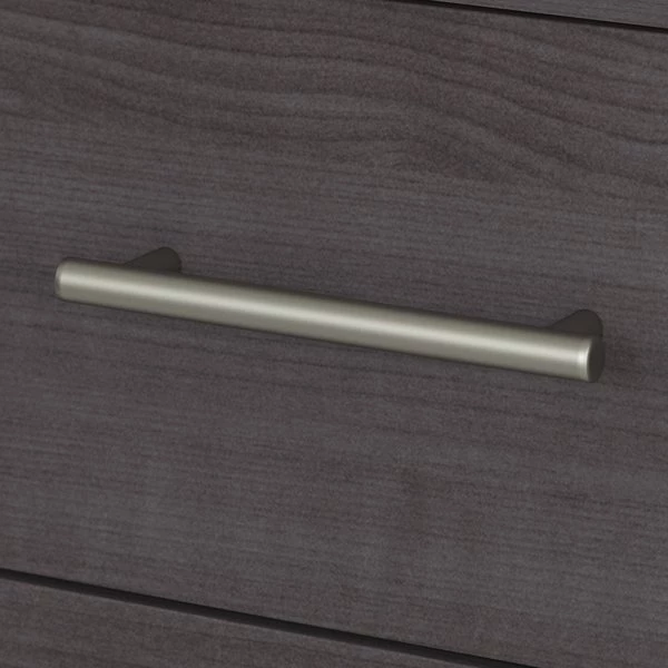 Build your ideal home office around the stylish and functional Bush Furniture Somerset 60W L Shaped Desk with Hutch and Lateral File Cabinet. This small office set features all the storage and versatility needed to create a practical, modern workstation. The expansive 60W surface with wire management offers ample room to spread out and complete large projects. A convenient pull-out shelf provides a perfect place to keep a keyboard or laptop, while a vertical storage cabinet with an adjustable shelf and a box drawer offer plenty of storage for office supplies and utensils and a file drawer accommodates letter-size documents. The Hutch has a large open compartment with one adjustable shelf for books, binders or decorations and two frosted glass doors for concealed storage. The Lateral File Cabinet utilizes smooth ball bearing slides for easy access to legal and letter size documents, even those all the way in the back. Drawers are designed to open one at a time for maximum stability, making the filing cabinet a safe and family-friendly storage solution. Transitional styling includes your choice of several attractive finishes with tapered leg accents and contemporary metal hardware for an alluring appearance. This home office furniture set is tested to meet ANSI/SOHO quality standards for safety and performance.