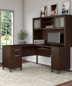 Maximize the potential of your home office with the Bush Furniture Somerset 60W L Shaped Desk with Hutch. This expansive workspace allows plenty of room to spread out and complete large projects. Create your remote work headquarters with space for your computer, phone, printer and more on a surface with wire management to keep cords and cables out of the way. A convenient pull-out shelf provides a perfect place to keep a keyboard or laptop, while a vertical storage cabinet with an adjustable shelf and a box drawer offer plenty of storage capacity for office supplies and writing utensils. A file drawer opens on smooth ball bearing slides for an easy reach to letter-size documents, even those all the way at the back. The Hutch features a large compartment with one adjustable shelf for books, binders or decorations. Two frosted glass doors provide concealed storage to eliminate visual clutter. Transitional styling includes your choice of several attractive finishes with tapered leg accents and contemporary metal hardware for an alluring appearance to match your current decor. This home office furniture set is tested to meet ANSI/SOHO standards for safety and performance. See the full Somerset Collection for coordinating items available to complete your home office.