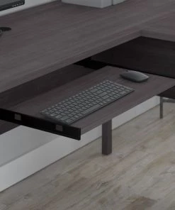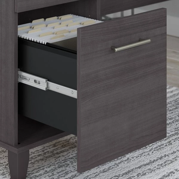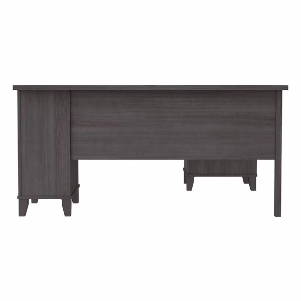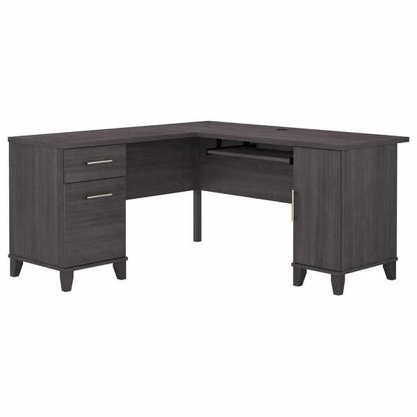 Make a professional statement while maximizing the potential of your home office with the Bush Furniture Somerset 60W L Shaped Desk. This expansive workspace offers plenty of room to spread out and complete large projects. Create your remote work headquarters with space for a computer, phone, printer and more with wire management to keep cords and cables secure and out of sight. A convenient pull-out shelf provides a perfect place to keep a keyboard or laptop. The stylish and functional L Shaped Desk design includes a vertical storage cabinet with an adjustable shelf to store items of various sizes. Place pens, paper and more office utensils in the box drawer, and enjoy a file drawer gliding on smooth ball bearing slides for an easy reach to letter-sized documents. The keyboard tray and pedestals mount on either side of the corner desk for a customizable home office design. Transitional styling includes your choice of attractive finishes with tapered leg accents and contemporary metal hardware for an alluring appearance to match your current decor. This home office desk with storage is tested to meet ANSI/SOHO quality standards for safety and performance. Add the coordinating 60W Hutch (sold separately) for additional storage and display capacity and see the full Somerset Collection for items available to complete your workspace.