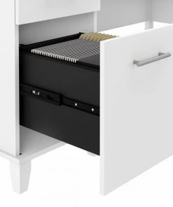Make a professional statement while maximizing the potential of your home office with the Bush Furniture Somerset 60W L Shaped Desk. This expansive workspace offers plenty of room to spread out and complete large projects. Create your remote work headquarters with space for a computer, phone, printer and more with wire management to keep cords and cables secure and out of sight. A convenient pull-out shelf provides a perfect place to keep a keyboard or laptop. The stylish and functional L Shaped Desk design includes a vertical storage cabinet with an adjustable shelf to store items of various sizes. Place pens, paper and more office utensils in the box drawer, and enjoy a file drawer gliding on smooth ball bearing slides for an easy reach to letter-sized documents. The keyboard tray and pedestals mount on either side of the corner desk for a customizable home office design. Transitional styling includes your choice of attractive finishes with tapered leg accents and contemporary metal hardware for an alluring appearance to match your current decor. This home office desk with storage is tested to meet ANSI/SOHO quality standards for safety and performance. Add the coordinating 60W Hutch (sold separately) for additional storage and display capacity and see the full Somerset Collection for items available to complete your workspace.