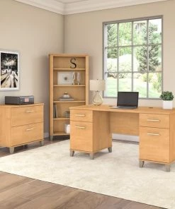 Make the best use of your workspace with the stylish and practical Bush Furniture Somerset 60W Office Desk. An ideal choice for your home office, the extended surface provides plenty of room for you to spread out with your computer, paperwork and more while built-in wire management grommets keep cords and cables in order. Stay organized with two box drawers to house miscellaneous office supplies and two file drawers with smooth ball bearing slides for storing letter-sized documents. Transitional styling includes your choice of several attractive finish options with tapered leg accents and contemporary metal hardware for an alluring appearance to match your current decor. This computer desk with drawers is tested to meet ANSI/SOHO quality standards for safety and performance. See the full Somerset Collection for coordinating items to complete your personal workspace with sophisticated furnishings that are built to last.