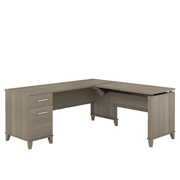 Upgrade your personal workspace with the ergonomic Bush Furniture Somerset 72W 3 Position Sit to Stand L Shaped Desk. As a quality alternative to desktop risers, the innovative 42W x 24D Sit to Stand Return offers all the health benefits of a standing desk with the versatility of more expensive electric height adjustable options. The built-in mechanical Lift-n-Lock system allows the desktop to lock into place at standing heights of 35, 38, and 41 inches and easily returns to a seated position. The Return has a counter-balanced design for stability and supports up to 20 pounds when elevated. The 72W x 24D Office Desk includes a file drawer that opens on full-extension ball bearing slides for easy access to legal and letter size documents in addition to a box drawer for supplies and utensils. Both the Desk and Return feature finished backs that allow the L Desk to look great no matter where it's positioned in the room. Wire management grommets are included on both surfaces to keep cords and cables secure and out of sight. Available in your choice of several attractive finishes with contemporary metal hardware and tapered leg accents, the height adjustable corner desk has an appealing look that works with virtually any decor. Fixed surfaces are tested to meet ANSI/SOHO standards for safety and performance while the mechanical lift system is rigorously tested to Bush Furniture's own quality standards.