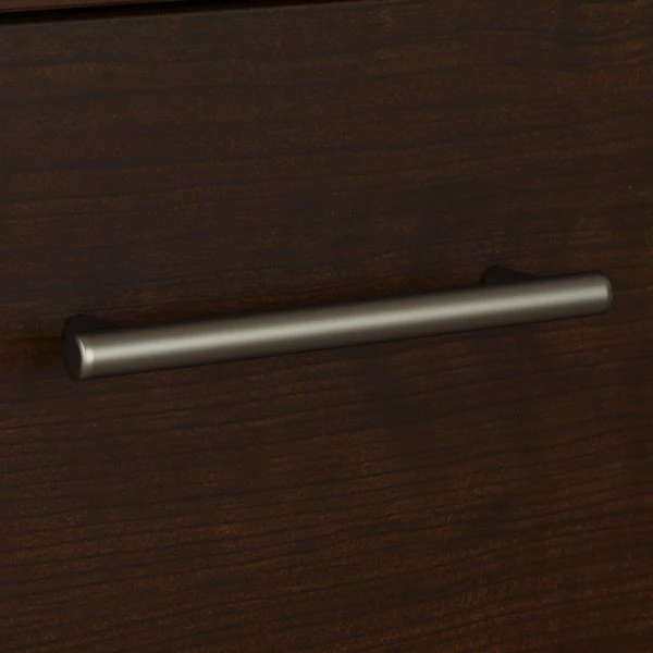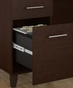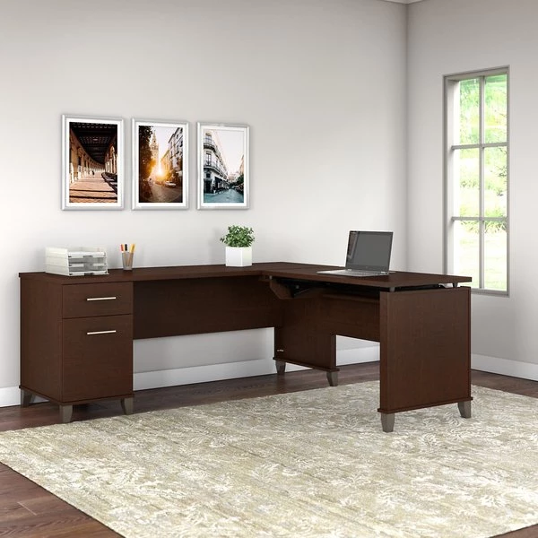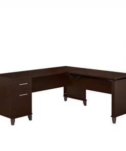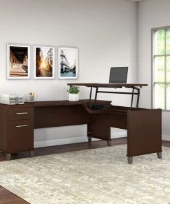 Upgrade your personal workspace with the ergonomic Bush Furniture Somerset 72W 3 Position Sit to Stand L Shaped Desk. As a quality alternative to desktop risers, the innovative 42W x 24D Sit to Stand Return offers all the health benefits of a standing desk with the versatility of more expensive electric height adjustable options. The built-in mechanical Lift-n-Lock system allows the desktop to lock into place at standing heights of 35, 38, and 41 inches and easily returns to a seated position. The Return has a counter-balanced design for stability and supports up to 20 pounds when elevated. The 72W x 24D Office Desk includes a file drawer that opens on full-extension ball bearing slides for easy access to legal and letter size documents in addition to a box drawer for supplies and utensils. Both the Desk and Return feature finished backs that allow the L Desk to look great no matter where it's positioned in the room. Wire management grommets are included on both surfaces to keep cords and cables secure and out of sight. Available in your choice of several attractive finishes with contemporary metal hardware and tapered leg accents, the height adjustable corner desk has an appealing look that works with virtually any decor. Fixed surfaces are tested to meet ANSI/SOHO standards for safety and performance while the mechanical lift system is rigorously tested to Bush Furniture's own quality standards.