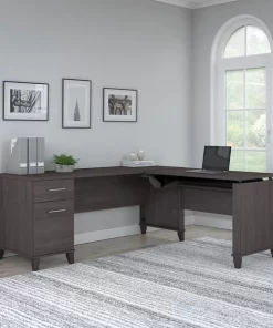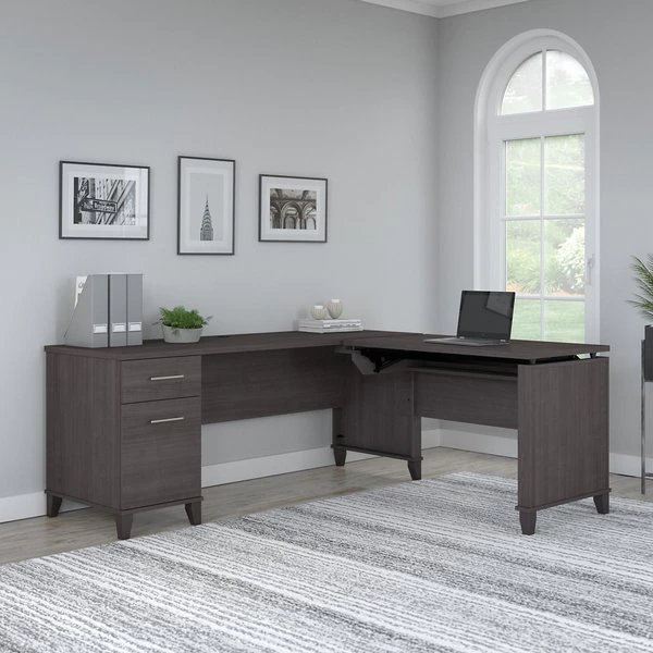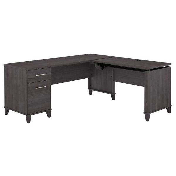 Upgrade your personal workspace with the ergonomic Bush Furniture Somerset 72W 3 Position Sit to Stand L Shaped Desk. As a quality alternative to desktop risers, the innovative 42W x 24D Sit to Stand Return offers all the health benefits of a standing desk with the versatility of more expensive electric height adjustable options. The built-in mechanical Lift-n-Lock system allows the desktop to lock into place at standing heights of 35, 38, and 41 inches and easily returns to a seated position. The Return has a counter-balanced design for stability and supports up to 20 pounds when elevated. The 72W x 24D Office Desk includes a file drawer that opens on full-extension ball bearing slides for easy access to legal and letter size documents in addition to a box drawer for supplies and utensils. Both the Desk and Return feature finished backs that allow the L Desk to look great no matter where it's positioned in the room. Wire management grommets are included on both surfaces to keep cords and cables secure and out of sight. Available in your choice of several attractive finishes with contemporary metal hardware and tapered leg accents, the height adjustable corner desk has an appealing look that works with virtually any decor. Fixed surfaces are tested to meet ANSI/SOHO standards for safety and performance while the mechanical lift system is rigorously tested to Bush Furniture's own quality standards.
