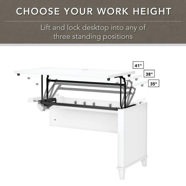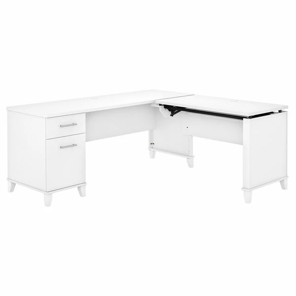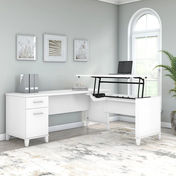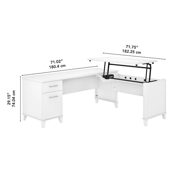 Upgrade your personal workspace with the ergonomic Bush Furniture Somerset 72W 3 Position Sit to Stand L Shaped Desk. As a quality alternative to desktop risers, the innovative 42W x 24D Sit to Stand Return offers all the health benefits of a standing desk with the versatility of more expensive electric height adjustable options. The built-in mechanical Lift-n-Lock system allows the desktop to lock into place at standing heights of 35, 38, and 41 inches and easily returns to a seated position. The Return has a counter-balanced design for stability and supports up to 20 pounds when elevated. The 72W x 24D Office Desk includes a file drawer that opens on full-extension ball bearing slides for easy access to legal and letter size documents in addition to a box drawer for supplies and utensils. Both the Desk and Return feature finished backs that allow the L Desk to look great no matter where it's positioned in the room. Wire management grommets are included on both surfaces to keep cords and cables secure and out of sight. Available in your choice of several attractive finishes with contemporary metal hardware and tapered leg accents, the height adjustable corner desk has an appealing look that works with virtually any decor. Fixed surfaces are tested to meet ANSI/SOHO standards for safety and performance while the mechanical lift system is rigorously tested to Bush Furniture's own quality standards.