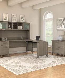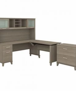 The Bush Furniture Somerset 72W 3 Position Sit to Stand L Shaped Desk with Hutch and Lateral File Cabinet offers an ideal solution for those seeking a stylish and functional ergonomic workspace. As a quality alternative to desktop risers, the innovative 42W x 24D Sit to Stand Return offers all the health benefits of a standing desk with the versatility of more expensive electric height adjustable options. The mechanical Lift-n-Lock system allows the desktop to lock into place at standing heights of 35, 38, and 41 inches and easily returns to a seated position. The 72W x 24D Office Desk includes its own storage with a file drawer and a box drawer for documents and supplies you want to keep close by. Both surfaces have wire management grommets to keep cords in order. The Hutch attaches to the desktop and adds frosted glass doors for concealed storage in addition to open cubby spaces with two shelves. The 2 drawer filing cabinet accepts legal and letter size files and opens on smooth full-extension ball bearing slides. Available in your choice of several attractive finishes with contemporary metal hardware and tapered leg accents, the adjustable corner desk has an appealing look that works with virtually any decor. Fixed surfaces are tested to meet ANSI/SOHO standards for safety and performance while the mechanical lift system is rigorously tested to Bush Furniture's own quality standards.